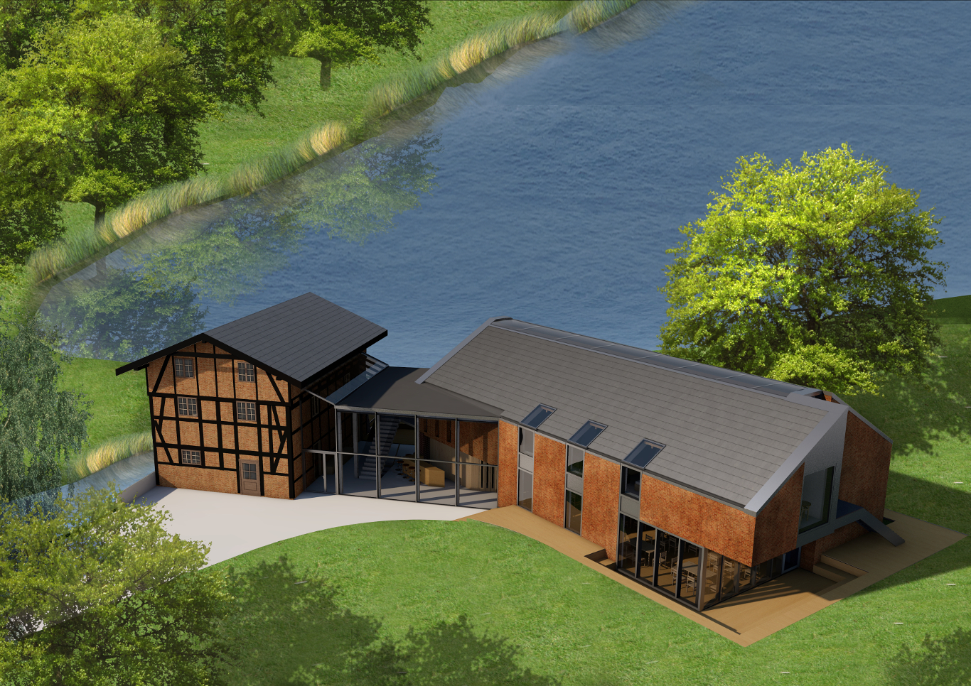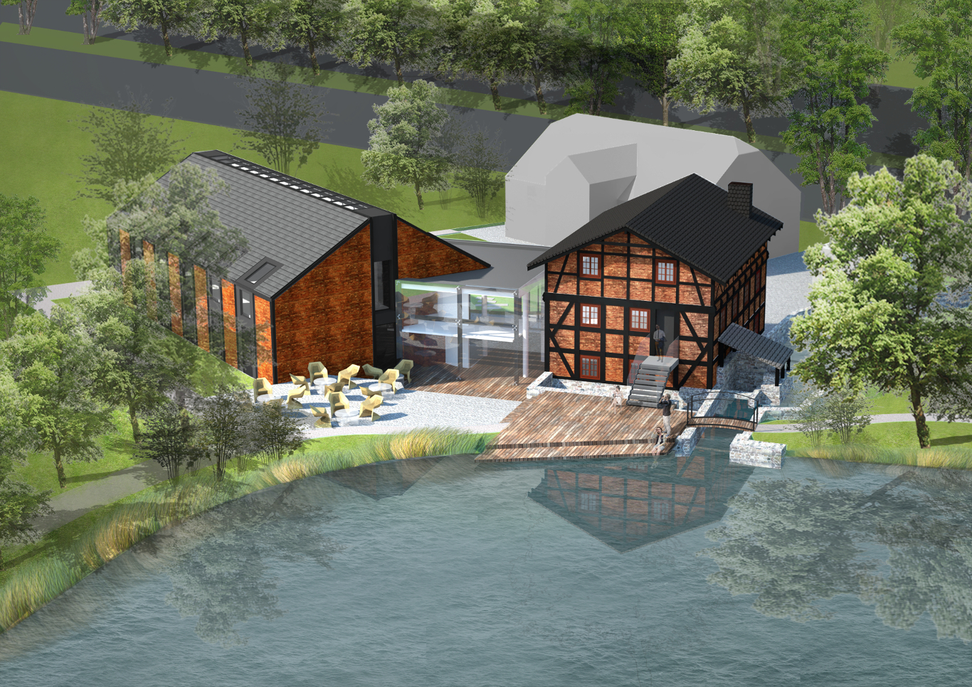 The investment area covered by the study is the area adjacent to the Oliwa Park and the newly designed housing estate. Connected from the side of Grunwaldzka Street. The site includes a historic mill building and a stream. The subject of the study is the extension of the existing mill along with the change of its use. Consumption rooms are located in the historical part of the mill. In the extended part, there is one large dining room for over 100 people and a hotel function. The hall, which is a one-story link between the new and the existing part, is the communication core of the new facility.