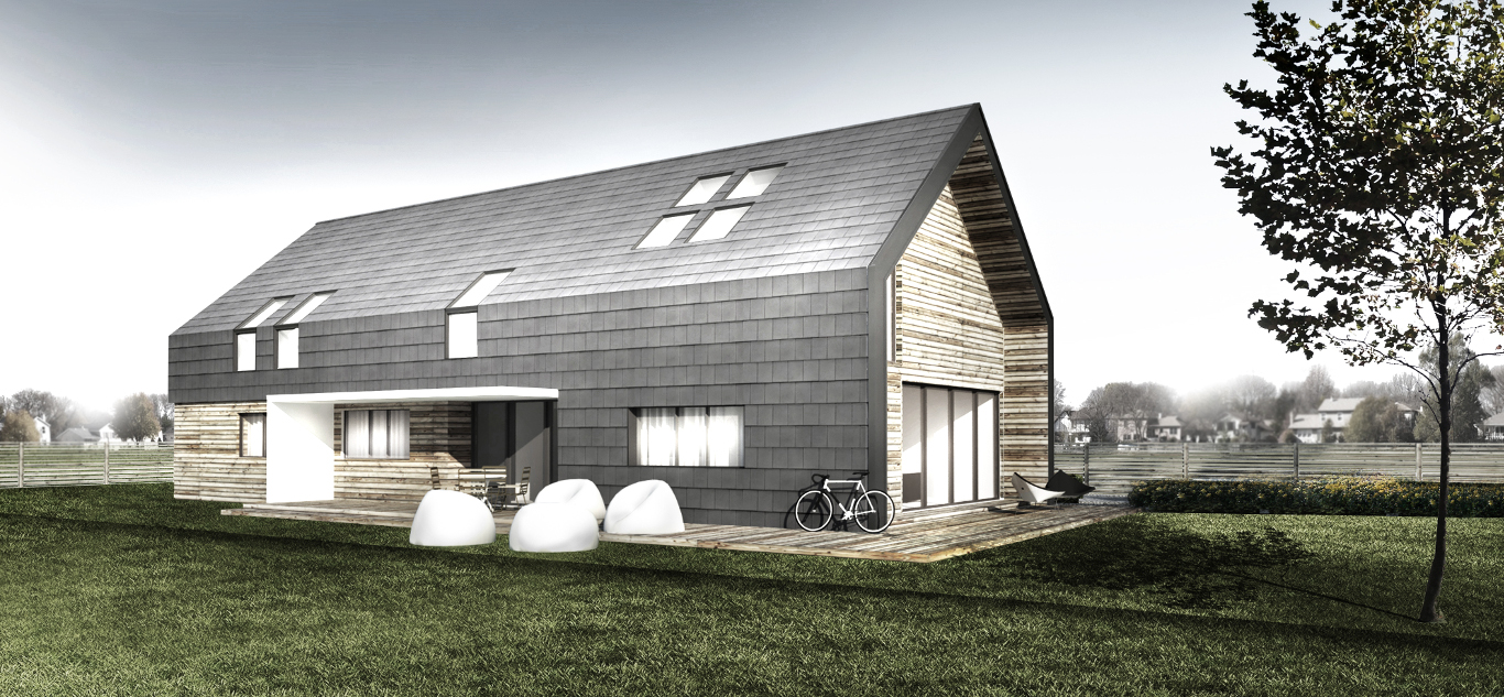 Dom przeznaczony dla 4 osobowej rodziny, zlokalizowany na Kaszubach. Budynek charakteryzuje się zwartą formą i jednolitym materiałem na dachu i elewacji. Kolorystyka, rodzaj użytych materiałów oraz proporcje bryły interpretują rozwiązania kaszubskiej architektury regionalnej. Dom wykończono grafitową dachówką ceramiczną płaską, która w swoim wyrazie nawiązuje do tradycyjnego gontu drewnianego.