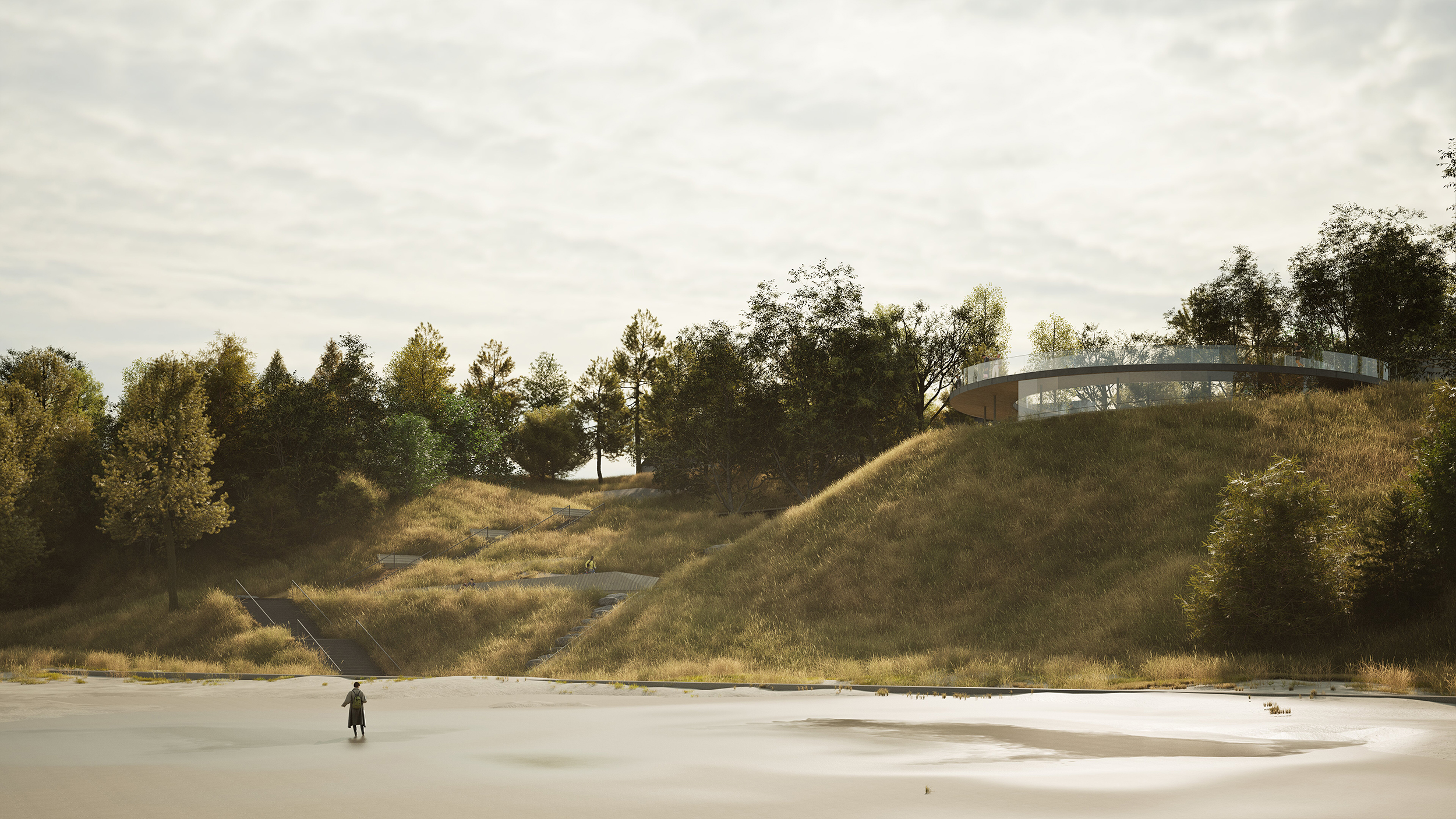 • filozofii poruszania się w obrębie projektowanego obiektu : wejście i wyjście na i z punktu widokowego nie musi odbywać się tą samą trasą, a poruszanie się po okręgu nawiązuje do idei nieskończoności, której poczucie wywołuje obserwowanie morskiego horyzontu