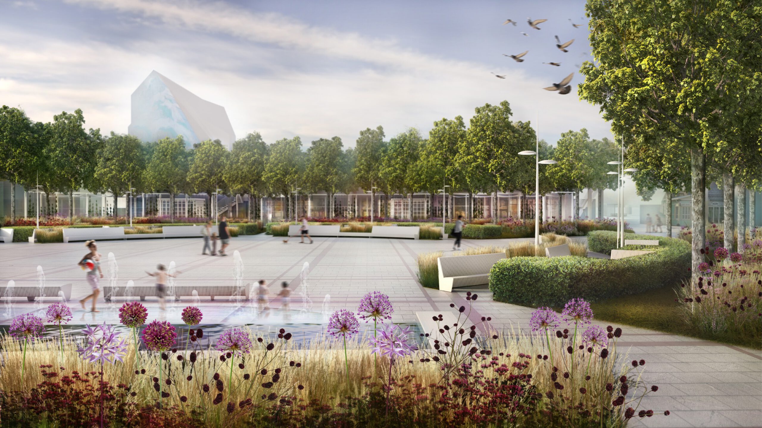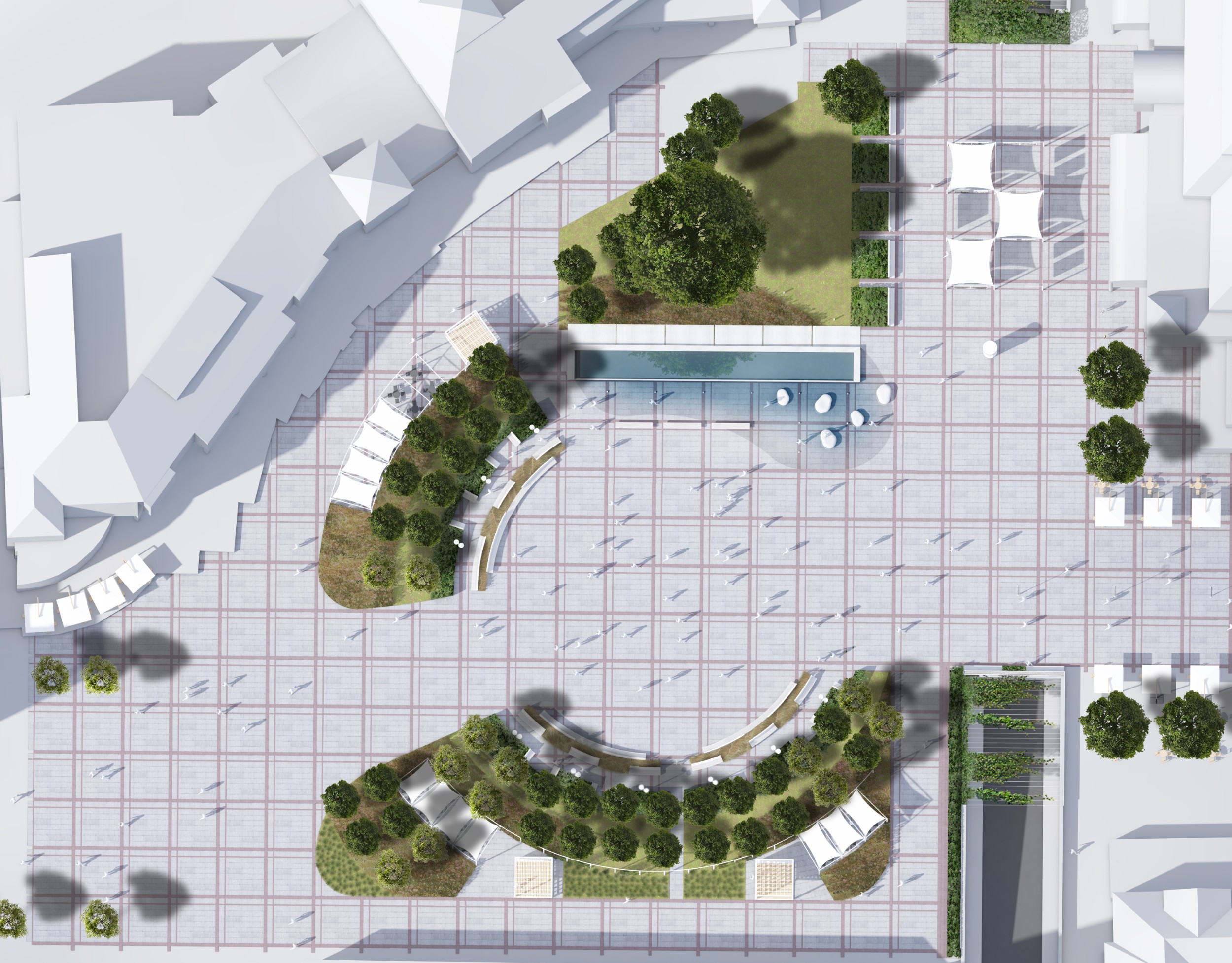 Z uwagi na niedookreślenie ram placu wprowadziliśmy element porządkujący i scalający przestrzeń : pergolę, kompozycyjnie powiązaną z rysunkiem placu oraz układem głównego szpaleru drzew. Nowo projektowana konstrukcja, nawiązująca kolorystycznie i geometrycznie do charakterystycznych cech architektury Sopotu (rytmy, kolor, linearność …), pozwala na wykreowanie w obrębie placu centralnej strefy reprezentacyjnej z fontanną, której nowa kompozycja przestrzenna przywraca odpowiednią rangę. Strefa centralna placu otoczona została kameralnymi enklawami zieleni z elementami małej architektury.